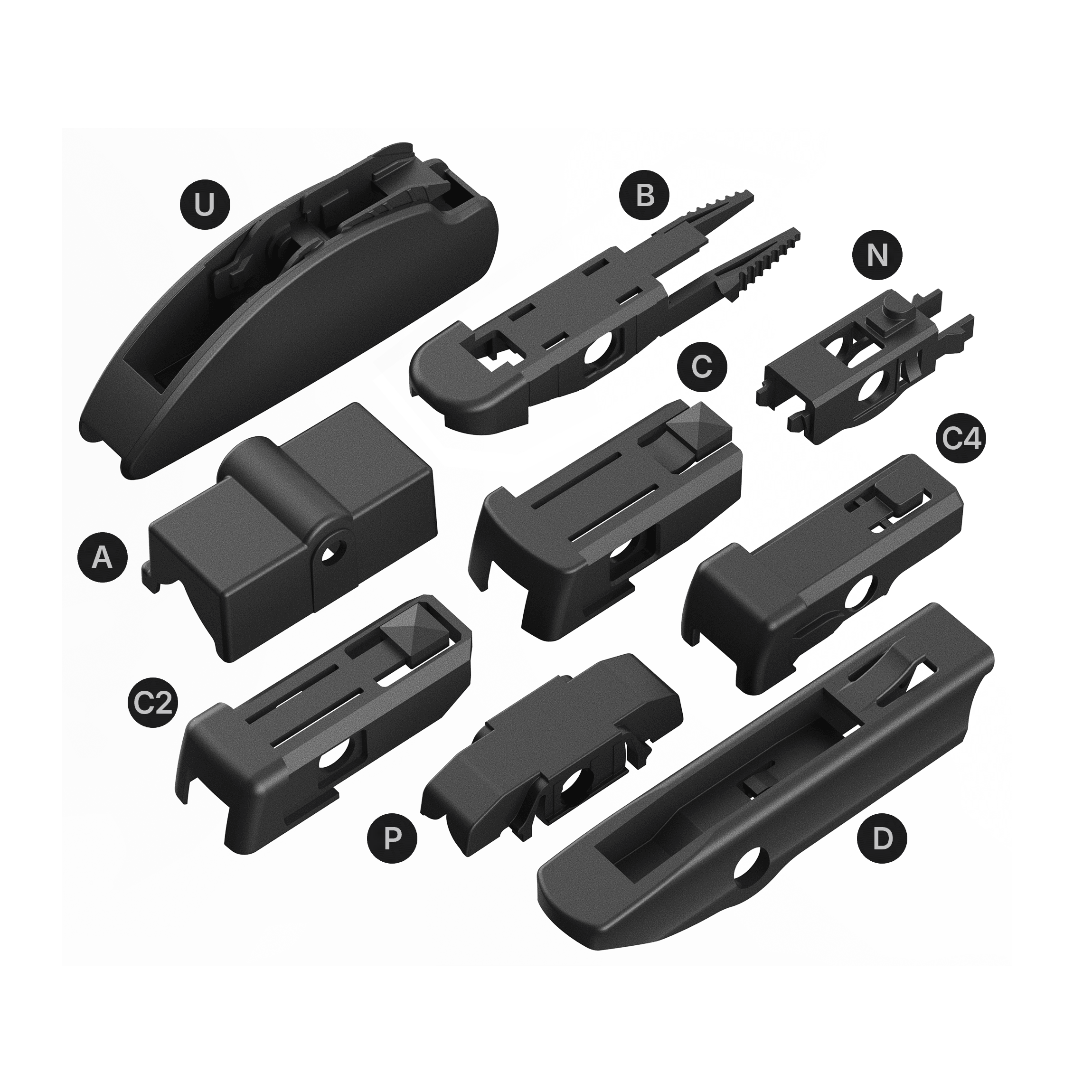 Paket içeriği: Ön cam için muz tipi silecek süpürgesi ve multi-clip çoklu bağlantı adaptörleri. (Pakete silecek kolu dahil değildir.)